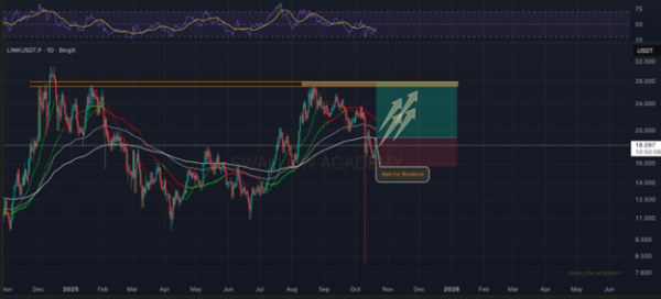 LINK shows a recovery setup as buyers defend the drop, but the price still sits below key EMAs. The confirmation for the best crypto to buy now crowd is a breakout and reclaim of those EMAs. If that hits, momentum can quickly target the $27 to $28 zone.