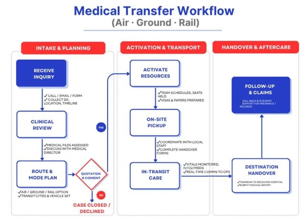•  Digital coordination platform. Case managers, clinicians, and partners share permits, checklists, and timelines in real time. This speeds airport clearance for stretchers and Private medical flights.