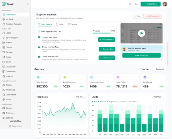 Taskip is more than just a tool; it’s an operating system designed to handle all aspects of agency management. From managing leads and projects to sending invoices and communicating with clients, Taskip centralizes everything into one cohesive platform.