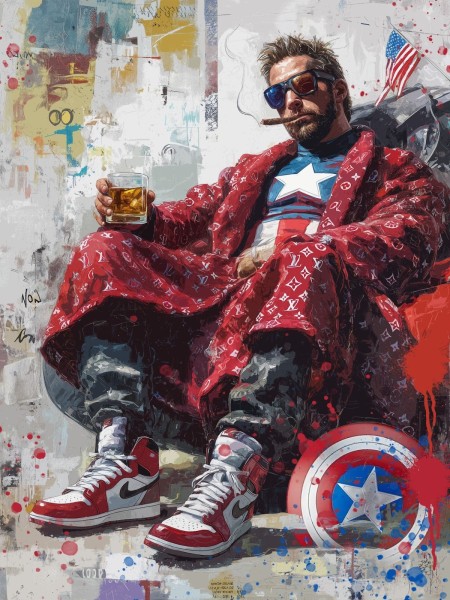 The compositions encourage observation and interpretation. Color contrasts, sweeping gestures, and layered textures invite viewers to linger, moving from humor to reflection. A glowing cigar becomes a quiet moment of ritual. A casual drink transforms into a symbolic pause. In these intimate interactions, the tension between persona and humanity comes alive.