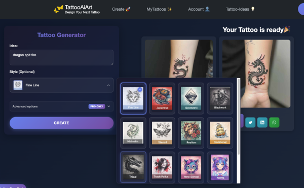 The platform supports a wide range of tattoo styles: fine line, blackwork, realism, Japanese, geometric, neo-traditional, watercolor, and tribal. It covers every major body placement including forearm, sleeve, chest, back, leg, shoulder, and bicep. It works on mobile, tablet, and desktop. The free tier requires no credit card and no account to start.